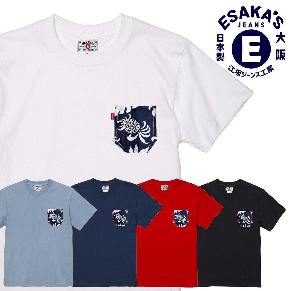 江坂ジーンズ アロハ胸ポケットNAVYパイナップル生地 Tシャツ アメカジ ハワイ