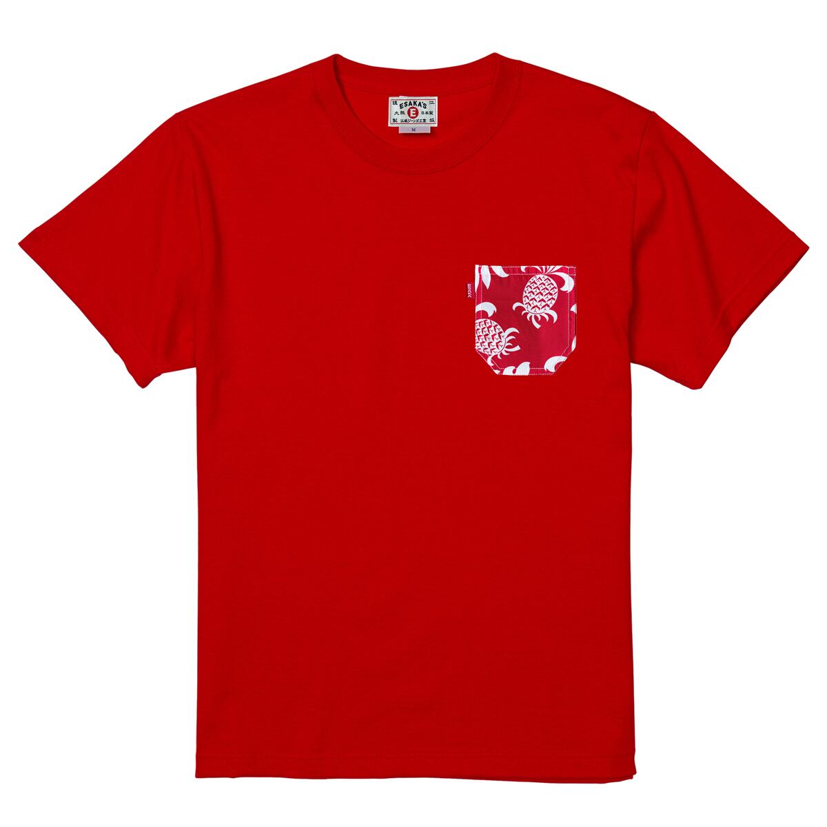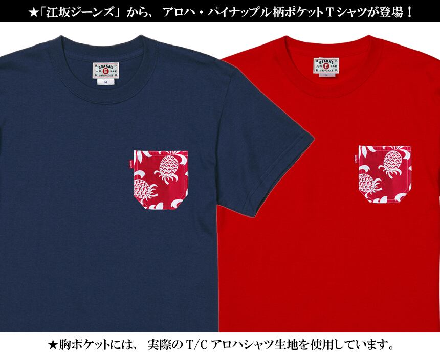 江坂ジーンズ アロハ胸ポケットREDパイナップル生地 Tシャツ アメカジ ハワイ