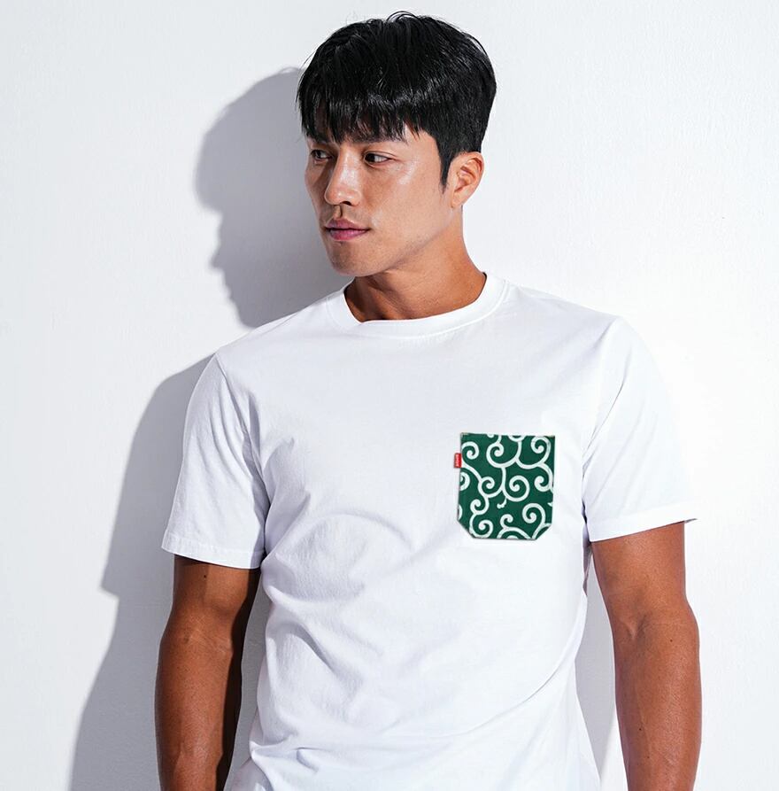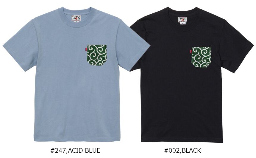 伝統的和柄の唐草模様生地を胸ポケットに使用した、人気のTシャツです。