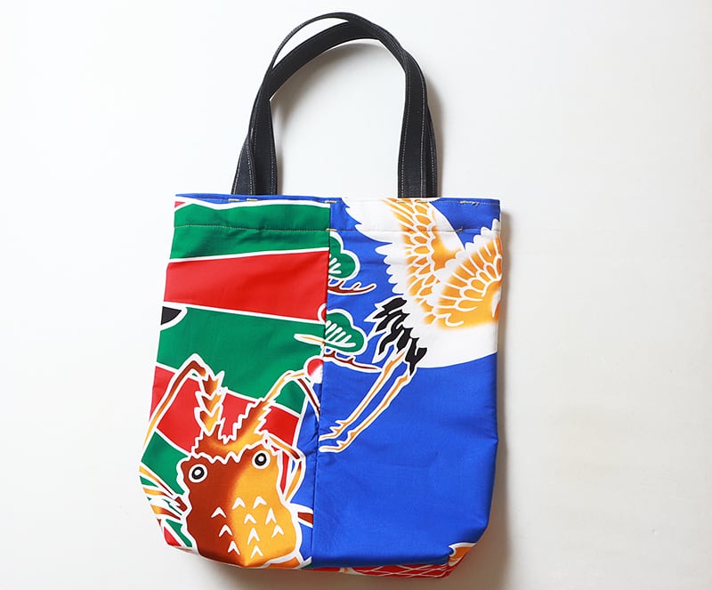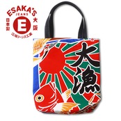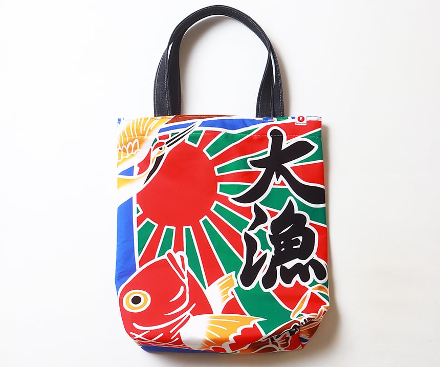 縁起の良い「大漁旗」柄のデザイン生地と丈夫な帆布生地で作成したトートバッグです。